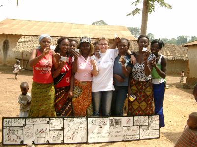 ©Nadin .Eckhardt Camille Bolé with people of Ponan that are singing to thank Espoir Tai for free condoms. Young women of Ponan.
